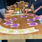 De teampuzzel is een interactieve tool waarmee teams – onder begeleiding – aan de slag kunnen met hun teamprofiel. Vanuit mijn eigen ervaring als trainer en coach, hou ik er wel van om zaken inzichtelijk te maken door fysiek aan te slag te kunnen gaan. We wilden graag iets wat mensen vast konden pakken en waardoor ze gelijk konden voelen/ervaren wat die drijfveren doen. Daarnaast wilden we graag iets waarmee we maatwerk konden leveren. Je kunt natuurlijk gekleurde platen op de grond leggen en zeggen: “ga bij je eigen belangrijkste drijfveer staan”, maar dat is zo statisch. Juist bij teams wil je ook gelijk die interactie op gang brengen, bovendien bestaat een drijfverenprofiel meestal uit meerdere drijfveren. Met onze teampuzzel worden teamleden uitgedaagd om gezamenlijk te bepalen welke stukjes er in de puzzel horen om zo het teamprofiel te leggen. Door een team dit met elkaar te laten doen worden de belangrijkste drijfveren zichtbaar door de interactie zichtbaar en daar kun je gelijk mee aan de slag.