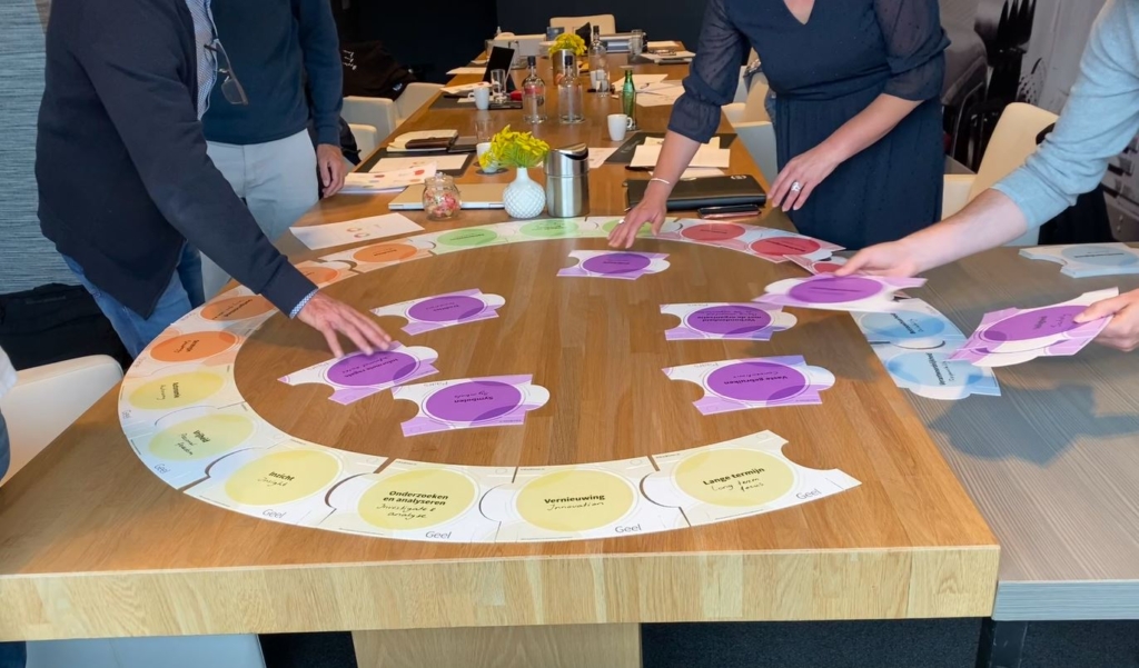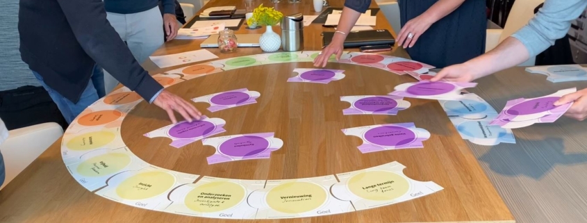 De teampuzzel is een interactieve tool waarmee teams – onder begeleiding – aan de slag kunnen met hun teamprofiel. Vanuit mijn eigen ervaring als trainer en coach, hou ik er wel van om zaken inzichtelijk te maken door fysiek aan te slag te kunnen gaan. We wilden graag iets wat mensen vast konden pakken en waardoor ze gelijk konden voelen/ervaren wat die drijfveren doen. Daarnaast wilden we graag iets waarmee we maatwerk konden leveren. Je kunt natuurlijk gekleurde platen op de grond leggen en zeggen: “ga bij je eigen belangrijkste drijfveer staan”, maar dat is zo statisch. Juist bij teams wil je ook gelijk die interactie op gang brengen, bovendien bestaat een drijfverenprofiel meestal uit meerdere drijfveren. Met onze teampuzzel worden teamleden uitgedaagd om gezamenlijk te bepalen welke stukjes er in de puzzel horen om zo het teamprofiel te leggen. Door een team dit met elkaar te laten doen worden de belangrijkste drijfveren zichtbaar door de interactie zichtbaar en daar kun je gelijk mee aan de slag.